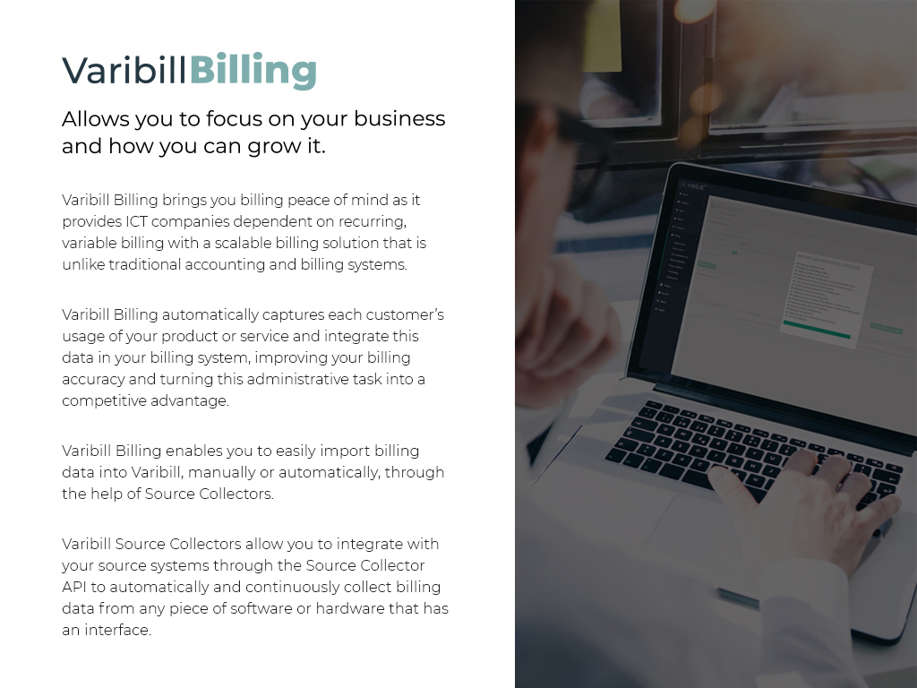 Varibill Billing provides accurate, streamlined billing for ICT companies using recurring, usage-based models. It consolidates data, automates usage collection, integrates with your accounting system, and handles currency conversions for efficient, accurate billing.